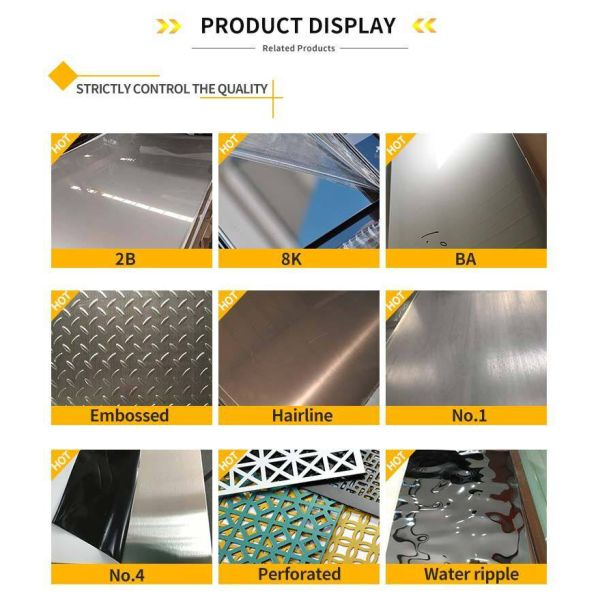 | Surface | 2B,2D,BA,NO.1,NO.4,NO.8,8K,mirror, checkered,embossed,hairline,sand blast,brush, etching,etc |